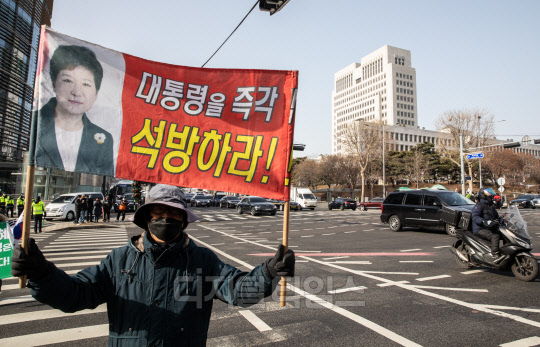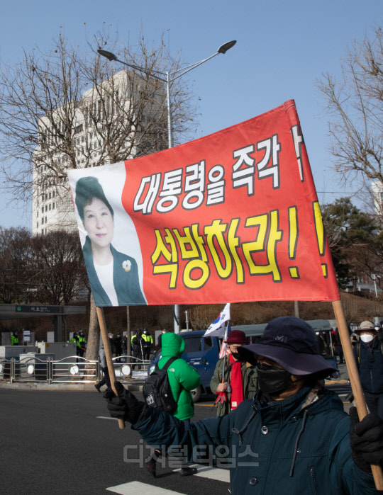 박근혜 전 대통령의 재상고심 선고 공판이 열린 14일 서울 서초역 사거리에서 지지자들이 석방을 촉구하고 있다. 대법원은 이날 특정범죄 가중처벌법상 뇌물 등 혐의로 기소된 박 전 대통령의 재상고심에서 징역 20년·벌금 180억원을 선고한 원심을 확정했다.