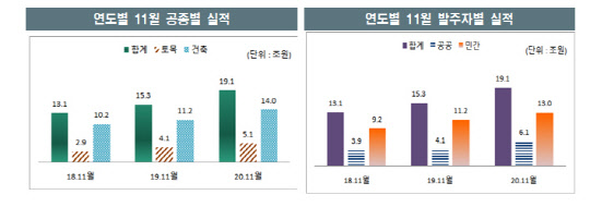 지난해 건설수주액이 주거용 건축 수주액이 크게 늘었기 때문이다. 작년 11월 기준 민간건설 누적수주액은 129조688억원으로 전년동월 대비 64.2% 급증했고 같은 기간 공공건설 누적수주액은 19조1002억원으로 24.9% 증가했다. 이중 민간부문 주거용 건축 누적 수주액은 72조584억원으로 1년 전보다 51.6%, 공공부문 주거용 건축 수주는 6조1192억원으로 23% 각각 증가했다.
