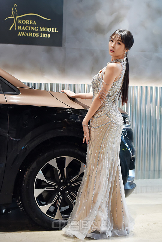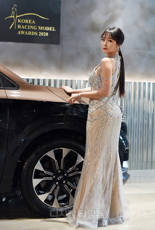레이싱모델 박지은이 경기도 성남시 더 헤리티지에서 진행된 '2020 한국 레이싱모델 어워즈(2020 Korea Racing Model Awards)'에서 '최우수 글로벌 스타상'을 수상, 포즈를 취하고 있다.
