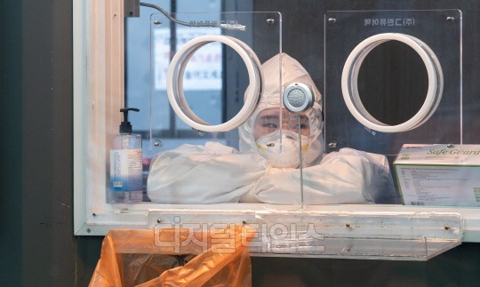 국내 코로나19 신규 확진자 수가 54일만에 300명대를 기록한 18일 서울역 광장에 마련된 임시선별진료소에서 의료진이 휴식을 취하고 있다.