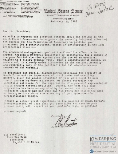 연세대 김대중도서관이 19일 발표한 사료에 따르면 바이든 당시 미국 상원의원은 1986년 2월 20일 존 케리 등 동료 상원의원 7명과 함께 "1988년 대통령 선거 직선제 개헌 서명운동을 탄압하는 데 심각한 우려를 표명한다"고 썼다.
