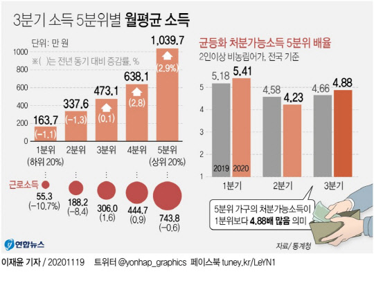 19일 통계청 국가통계포털(KOSIS)에 따르면 지난해 3분기 기준 1분위(소득 하위 20%) 가구의 가계소득은 163만7000원으로 1년 전보다 1.1% 감소했다. 반면 5분위(소득 상위 20%) 소득은 1039만7000원으로 외려 2.9% 증가했다. 1분위의 경우 근로소득(55만3000원)과 사업소득(27만6000원)이 10.7%, 8.1%씩 줄어든 영향이 컸다. 코로나19 충격으로 임시·일용직 등 '약한 고리'의 취업자 감소 여파가 작용한 것이다.