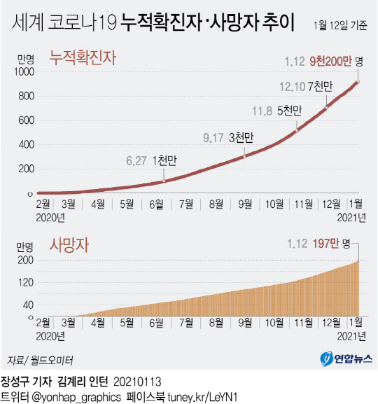 이날 0시 기준으로 국내 코로나19 누적 확진자는 7만3000여명, 사망자는 1283명이다. 또 세계적으론 누적 확진자 9600만명, 사망자는 200만명을 넘었다. 화이자, 아스트라제네카 등의 백신 개발과 함께 세계적으로 3000만회분의 백신이 접종되기 시작했지만, 여전히 코로나19 확산세는 꺾이지 않고 있다.