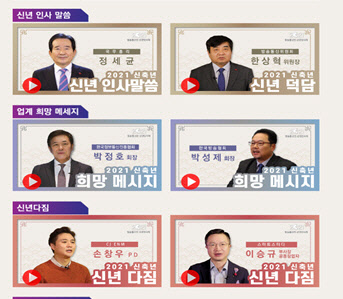 한국정보통신진흥협회(회장 박정호), 한국방송협회(회장 박성제) 등 총 17개 방송통신 유관협회 및 기관은 '2021 방송통신인 신년인사회'를 비대면으로 개최한다. 한국정보통신진흥협회는 정세균 국무총리, 한상혁 방송통신위원회 위원장, 방송통신업계 대표 등의 신년사와 다짐을 동영상으로 제작, 연하장 형태로 온라인을 통해 발송한다고 밝혔다.