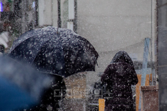 눈이 내리고 있는 28일 서울 중구 정동길 거리에서 시민들이 분주히 발걸음을 옮기고 있다.