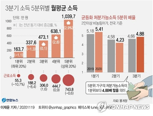 작년 3분기 1분위(소득하위 20%) 근로소득은 55만3000원으로 전년 동기 대비 10.7%나 감소했다. 이에 비해 5분위(소득상위 20%) 근로소득은 743만8000원으로 0.6% 감소하는 데 그쳤다.