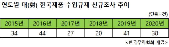 작년 1년 동안 한국 제품을 상대로 한 글로벌 수입규제는 총 38건이 늘었다. 최근 6년 간의 추이를 보면 미국 트럼프 정부 출범 직전인 2016년(44건)과 미·중 무역전쟁이 1차 합의에 이르렀던 2019년(41건)과 비슷한 숫자다.