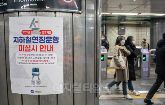 서울시가 코로나19 확산 방지를 위해 올해 설 연휴기간 대중교통의 막차 시간 연장과 일부 노선 증회 등 조치를 시행하지 않는다고 8일 밝혔다. 사진은 이날 지하철역에 붙은 연휴기간 연장운행 미실시 안내문.