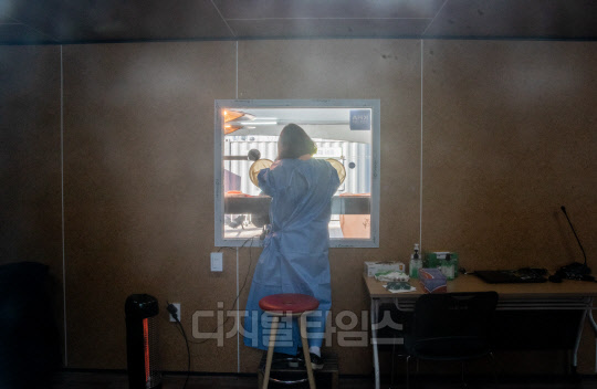 국내 코로나19 신규 확진자 수가 200명대로 떨어진 8일 서울광장에 마련된 임시선별진료소에서 의료진이 검체를 채취하고 있다.