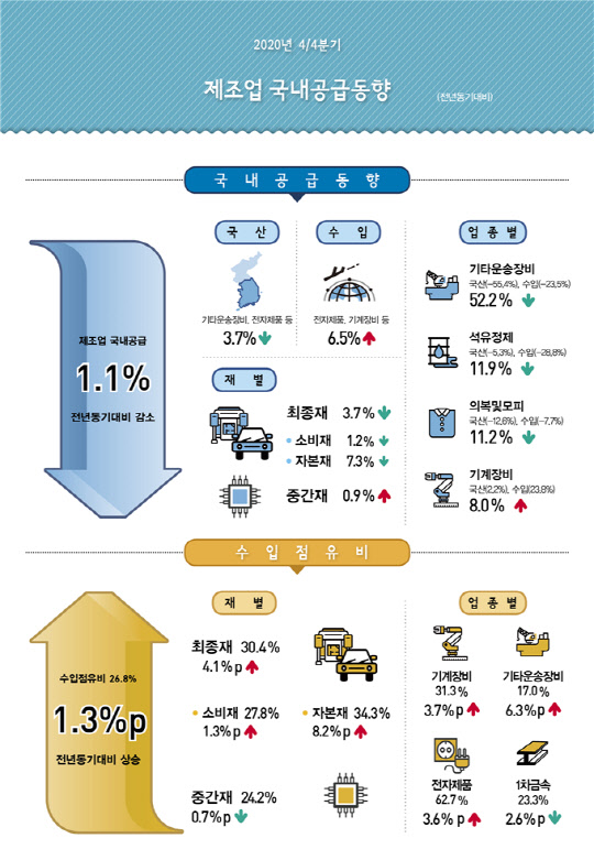 최종재 국내공급 2.8% 감소 작년 제조업 국내공급이 코로나19 탓에 1% 가까이 감소했다. 3년 연속 감소세다.