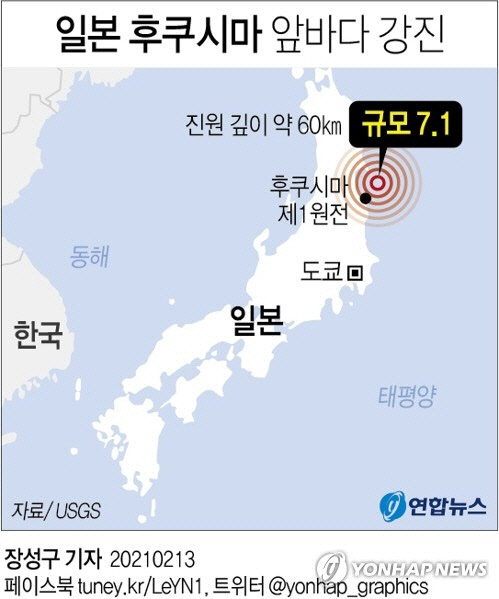 일본 기상청에 따르면 진원의 위치는 북위 37.7도 동경 141.8도이며, 진원의 깊이는 약 60㎞로 추정됐다.