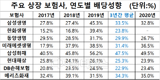 반면 삼성화재, DB손해보험, 메리츠화재는 최근 3년치 평균보다 소폭 오른 수준에서 배당성향을 결정했다. 하지만 해당 보험사도 당국의 권고로 배당금 지급을 크게 늘리지는 못했다.