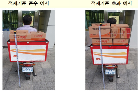 먼저 각 우체국의 책임직이 매일 이륜차 적재기준 준수를 점검한다. 적재기준은 △길이는 적재장치 길이에 30cm를 더한 길이 이내 △너비는 후사경으로 뒤쪽을 확인할 수 있는 범위 △높이는 지상에서 1.5m 이내 △중량은 60kg 이내이다. 특히 높이 1.5m 이내는 도로교통법 시행령 제22조(운행상의 안전기준) 보다 강화된 기준이다.
