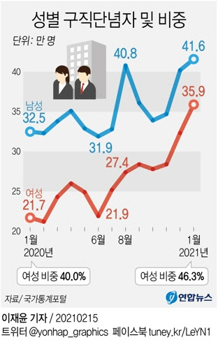 여성 구직단념자는 지난해 11월부터 올해 1월까지 3개월 연속 역대 최대 기록을 경신했다. 전체 구직단념자 중 여성이 차지하는 비중도 46.3%로 역시 사상 최대치다.