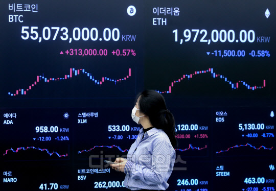 비트코인이 5만 달러(한화 약 5천 5백만원)를 돌파한 17일 서울 강남구 암호화폐 거래소 업비트 라운지 시세 전광판에 현황이 표시되고 있다.