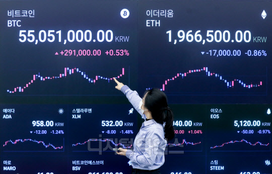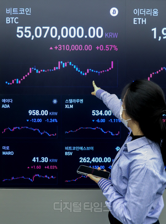 비트코인이 5만 달러(한화 약 5천 5백만원)를 돌파한 17일 서울 강남구 암호화폐 거래소 업비트 라운지 시세 전광판에 현황이 표시되고 있다.