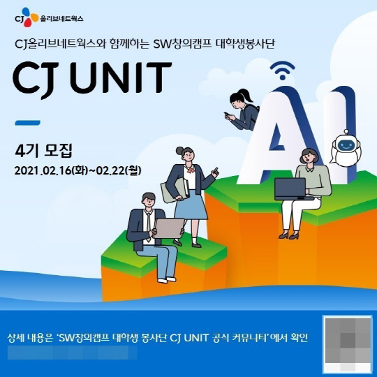 이번에 모집하는CJ UNIT 4기는 AI(인공지능), 빅데이터 등 IT기술 기반의 SW코딩교육, SNS를 통한 홍보활동에 재능과 관심이 있는 대학생이라면 누구나 지원할 수 있다. 지원서 접수와 온라인 면접 등의 과정을 통해 총 30명 규모로 선발한다.