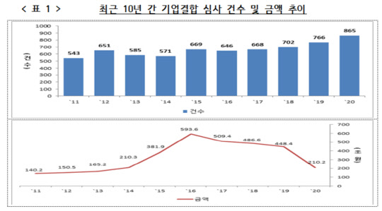 18일 공정거래위원회는 이 같은 내용의 '2020년 기업결합 동향'을 발표했다. 이에 따르면 지난해 공정위가 심사를 마친 기업결합은 865건으로 2019년(766건) 대비 99건 늘어났다. 국내 기업에 의한 기업결합은 134건 증가한 732건이었는데, 성장동력 확보 등의 의미를 갖는 비계열사와의 결합 건수는 130건 늘어난 556건으로 집계됐다. M&A 금액 역시 24조3000억원에서 31조5000억원으로 7조2000억원 껑충 뛰었다.