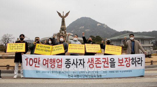 여행업 생존 비대위 회원들이 22일 서울 종로구 청와대 분수광장에서 기자회견을 열고 코로나19 사태로 피해를 입은 여행업 종사자들의 생존권 보장을 촉구하고 있다.