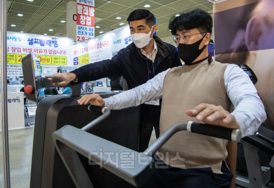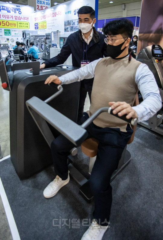 AI 인공지능 PT센터 밀론부티크 관계자들이 25일 서울 강남구 코엑스에서 열린 59회 프랜차이즈 창업박람회 2021에서 기구 시연을 하고 있다.