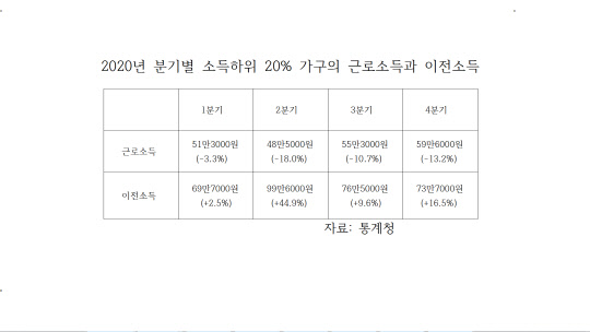 통계청의 2020년 가계통향조사에 따르면 소득 하위 20%(1분위)에 속하는 저소득층의 근로소득이 지난해 분기 내내 감소한 것으로 나타났다. 이에 비해 재난지원금 등 정부 보조금 등을 일컫는 이전소득은 분기 내내 증가했다. 결국 지난해 저소득층은 정부 보조금으로 겨우 연명했다는 뜻이다.