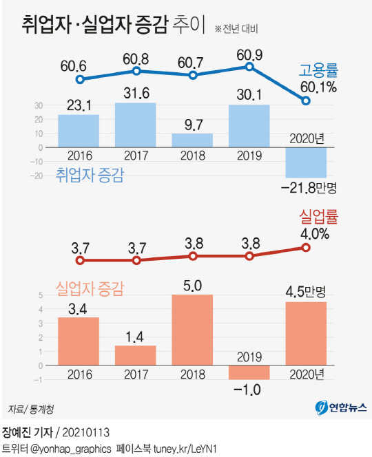 25일 통계청에 따르면 지난해 경기침체에 더해 코로나19 사태까지 겹치면서 지난해 취업자 수는 총 2690만4000명으로 전년 대비 21만8000명 감소했다. 1998년 외환위기 이후 22년 만에 최악의 고용 실적이다. 연간으로 취업자가 줄어들었던 때는 1984년(-7만6000명), 1998년(-127만6000명), 2003년(-1만명), 2009년(-8만7000명) 등 다섯 번 뿐이다.