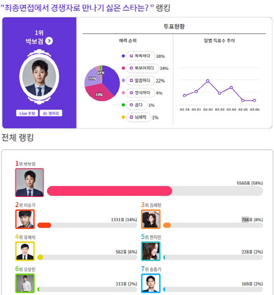 커뮤니티 포털사이트 디시인사이드(대표 김유식)와 취향 검색 기업 마이셀럽스가 운영 중인 '익사이팅디시'가 '최종면접에서 경쟁자로 만나기 싫은 스타는?'으로 투표를 실시한 결과 박보검이 1위에 올랐다. 이 투표는 지난 2월 28일부터 3월 6일까지 총 7일간 진행했다.