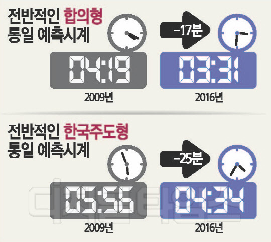 통일시계 프로젝트는 중단 없이 지속적으로 진행되지는 않았다. 2009년, 2010년, 2011년 2014년 상반기, 2014년 하반기, 2015년, 2016년의 7차례에 걸쳐 통일예측시각이 도출되었다. 2009년이 통일에 가장 가까웠으며, 이후에는 부침이 있었지만, 전반적으로 통일환경이 악화되었음을 확인할 수 있다.