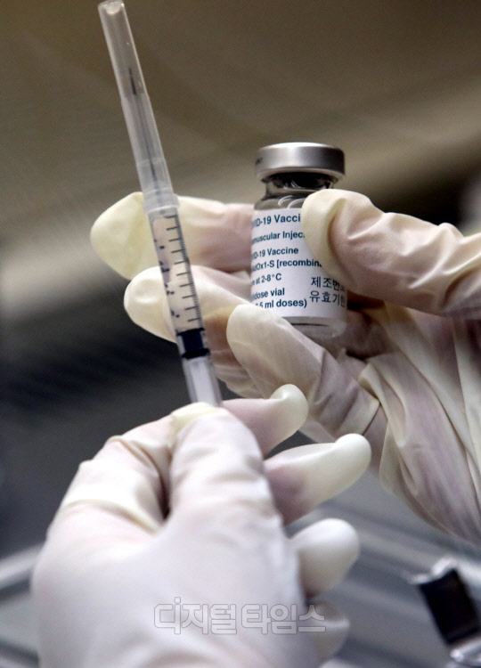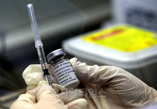 15일 서울 성동구청에 마련된 서울시 1호 코로나 예방접종센터에서 의료진이 백신 조제과정을 시연하고 있다.