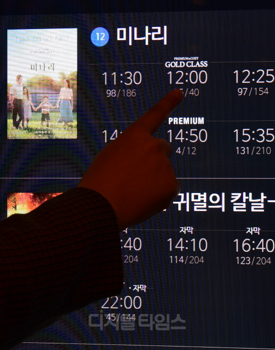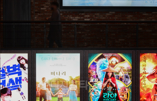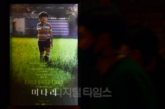 정이삭 감독의 영화 '미나리'기 93회 미국 아카데미 시상식에서 작품상, 감독상, 남우주연상(스티븐 연), 여우조연상(윤여정), 각본상, 음악상(에밀 모세리) 부문의 후보에 오르며 쾌거를 이뤘다. 사진은 16일 영화 '미나리'가 상영 중인 서울 시내 영화관 모습.