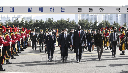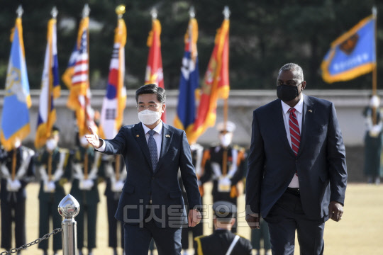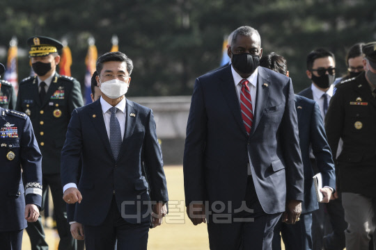 서욱 국방부 장관과 로이드 오스틴 미 국방 장관이 17일 서울 국방부에서 의장행사를 마치고 한미 국방장관 회담을 위해 이동하고 있다.