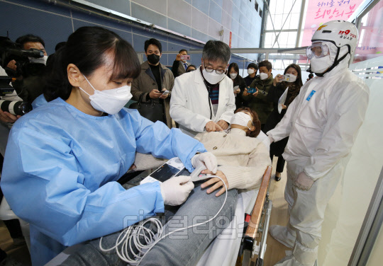 17일 충남 천안시 서북구 실내테니스장에 마련된 예방접종센터에서 실시된 지역 예방접종센터 모의훈련에서 의료진이 이상반응 발생 접종대상자를 응급처치실로 이송하고 있다.