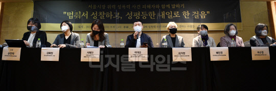 피해자의 전 직장 동료 이대호 전 서울시미디어 비서관이 17일 서울 중구 명동의 한 호텔에서 열린 '서울시장 위력 성폭력 사건 피해자와 함께 말하기' 기자회견에 참석해 서울시장 후보에게 성폭력 사건과 관련한 당부의 말을 하고 있다.