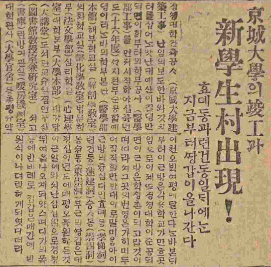 1925년 1월 15일자 매일신보에 '경성대학의 준공과 신학생촌 출현, 효제동과 연건동 일대는 지금부터 땅값이 올라간다'라는 제목의 기사가 보인다. "경성대학 건축공사는 이미 보도한 바와 같이 터를 잡아놓았는데 예산이 결정만 되면 올해부터 공사를 시작하여 1927년까지 전부 준공할 예정이라는 바, (중략) 총 2,500여 평에 달한다는 바, 본래부터 이 근방은 각종 학교가 많은 곳이므로 이제 또 경성대학이 준공되면 이 근방은 학생촌이 되고 말 것이며, 따라서 그곳의 번영은 가히 미루어 짐작 할 만한데, 이로 말미암아 이 근방의 중심지인 효제동, 연건동, 숭4동, 동숭동 부근의 땅값은 1923년에 평당 5,6원 하던 것이 최근에 와서는 30원으로 껑충 뛰어올라오게 됐다더라."