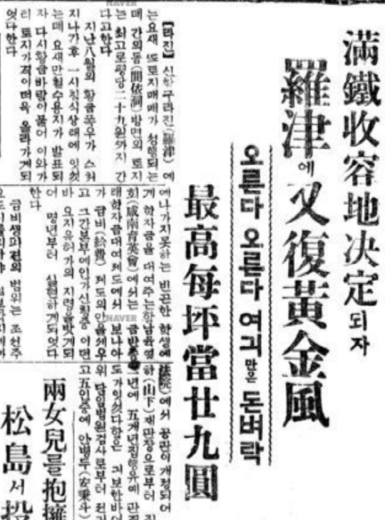 삽시간에 나진에 황금바람이 불기 시작했다. 1932년 12월 27일자 매일신보에 '만철 수용지 결정되자 나진에 또다시 황금풍(黃金風), 오른다 오른다 여기만은 돈벼락, 평당 29원'란 제목의 기사가 나온다. "신항구 나진에는 요새 또 토지매매가 성행되는데, 간의동(間依洞) 방면의 토지는 최고로 평당 29원까지 간다고 한다. (중략) 만철 수용지가 발표되자 황금바람이 불어 토지가격이 더욱 올라가게 되었다 한다."