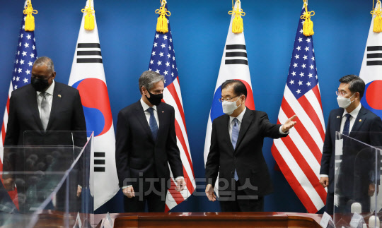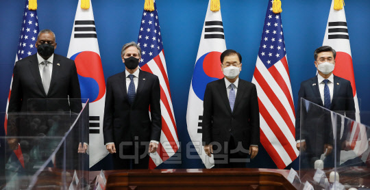 정의용 외교부 장관과 서욱 국방부 장관이 18일 서울 종로구 외교부 청사에서 열린 한미 외교·국방장관회의에 앞서 토니 블링컨 미 국무장관, 로이드 오스틴 국방장관과 함께 기념촬영을 하고 있다.