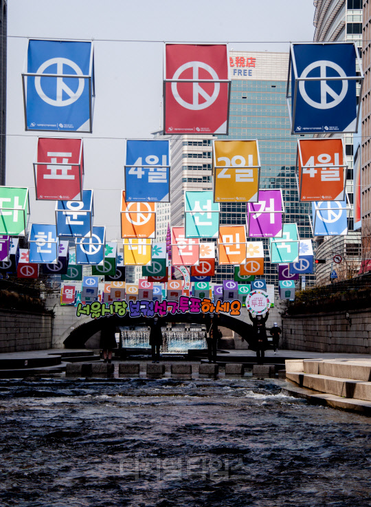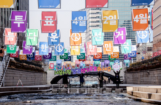 4·7 재·보궐선거를 보름 앞둔 23일 서울 중구 무교동 청계천 모전교 인근에서 서울시 선거관리위원회 직원들이 서울시장 보궐선거 투표 참여를 촉구하는 캠페인을 하고 있다.