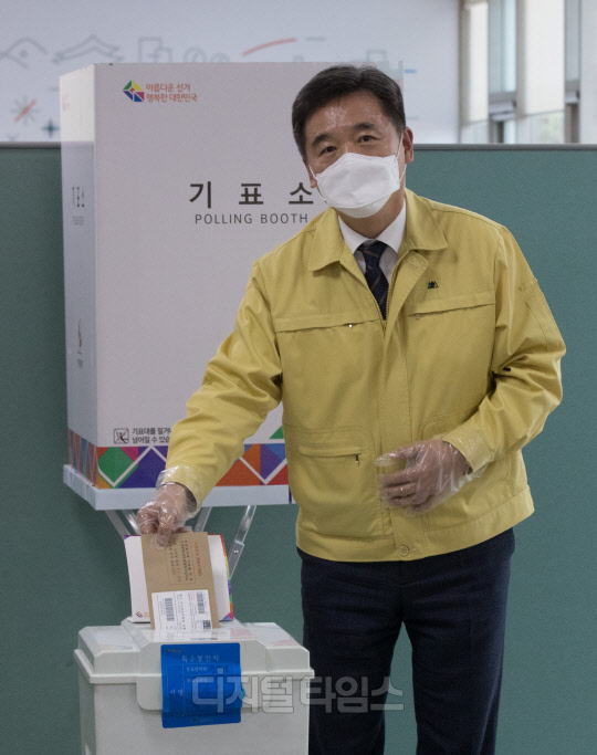4·7 재·보궐선거를 보름 앞둔 23일 중구 서울유스호스텔 생활치료센터에 마련된 특별사전투표소를 찾은 서정협 서울시장 권한대행이 사전투표 모의실습을 하며 점검하고 있다.