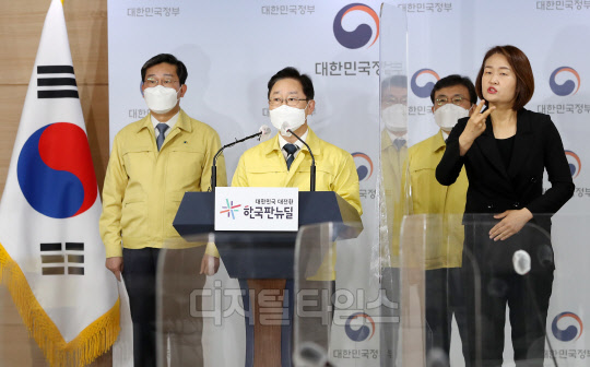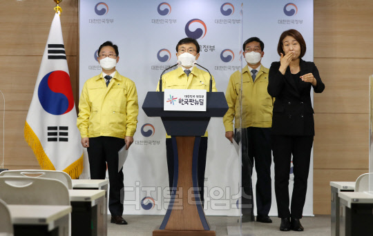 박범계 법무부 장관, 전해철 행정안전부 장관, 권덕철 보건복지부 장관이 25일 정부서울청사에서 2021년 재보궐 선거를 앞두고 대국민 담화 발표를 하고 있다.
