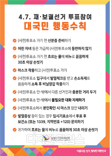 코로나19 확진자 및 자가격리자의 투표권도 최대한 보장된다. 확진자는 거소투표제도와 생활치료센터에 마련된 특별 사전투표소를 통해 투표가 가능하다. 자가격리자는 투표참여 의사확인 절차를 거쳐 선거일인 내달 7일 당일 임시외출이 허용돼 투표가 가능하다.투표소 방역대책은 21대 국회의원 선거에 준해 실시된다. 투표 전·후 투표소 전체 소독을 실시하고 투표사무원 대상 감염병 예방교육이 이뤄진다. 투표사무원은 마스크와 일회용 장갑을 착용한 후 업무를 수행해야 한다. 투표권자는 투표소 진입 시 발열체크를 하고 이상이 없는 경우 손 소독 및 일회용 비닐장갑 착용 후 투표를 하게 된다. 이상증상이 있는 투표권자는 동선을 분리해 별도 임시기표소에서 투표를 하도록 안내할 에정이다. 수시로 접촉하게 되는 기표용구, 기표대, 본인확인기 등은 소독티슈 등으로 소독이 이뤄질 예정이다.은진기자 jineun@dt.co.kr