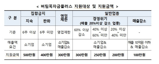 중기부는 맞춤형 피해 지원을 위해 지원 유형을 총 7개로 세분화했다. 이에 따라 지난해 11월 24일부터 올 2월 14일까지 총 12주 중 집합금지 조치가 6주 이상인 사업체는 500만원, 6주 미만 사업체는 400만원을 각각 지원한다.