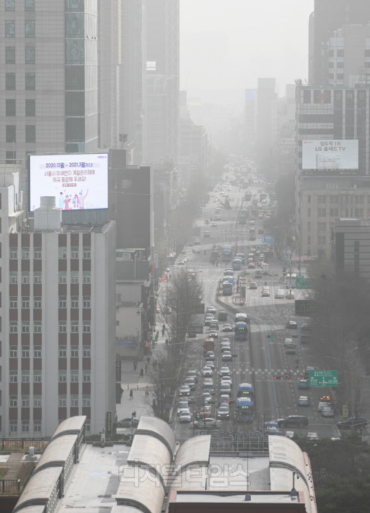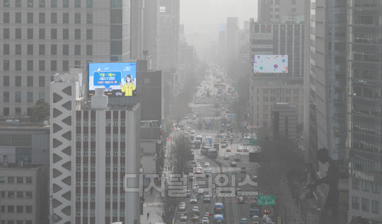 서울 지역에 황사 경보가 내려진 29일 종로구 세종대로사거리 일대가 뿌옇게 보이고 있다.