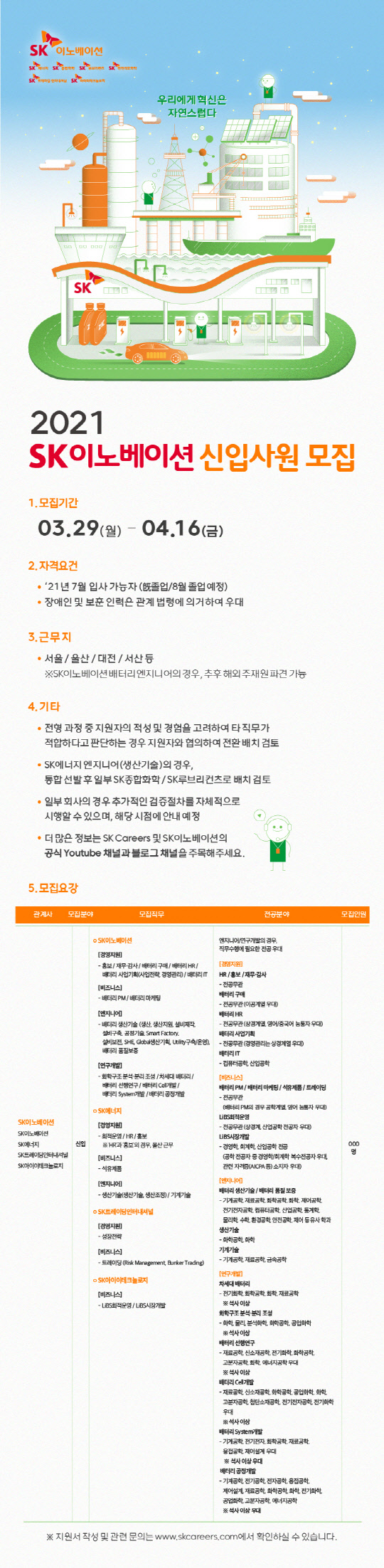 채용공고는 이날부터 SK그룹 채용사이트에서 확인할 수 있으며, SK이노베이션의 전문 보도채널 '스키노뉴스'와 유튜브 채널, SK커리어 유튜브 채널 등에서 채용과 관련한 추가적인 정보를 지원자들에게 제공할 예정이다.