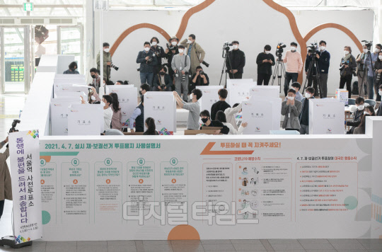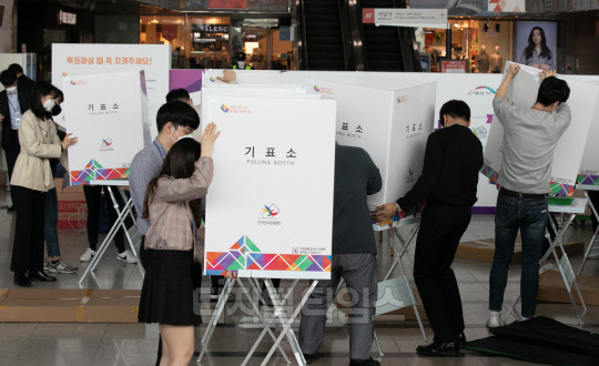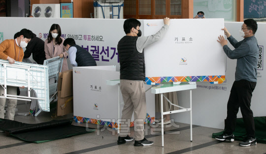 4·7 재보궐 선거 사전투표를 하루 앞둔 1일 서울역에서 선관위 관계자들이 남영동 사전투표소 설비를 설치하고 있다.