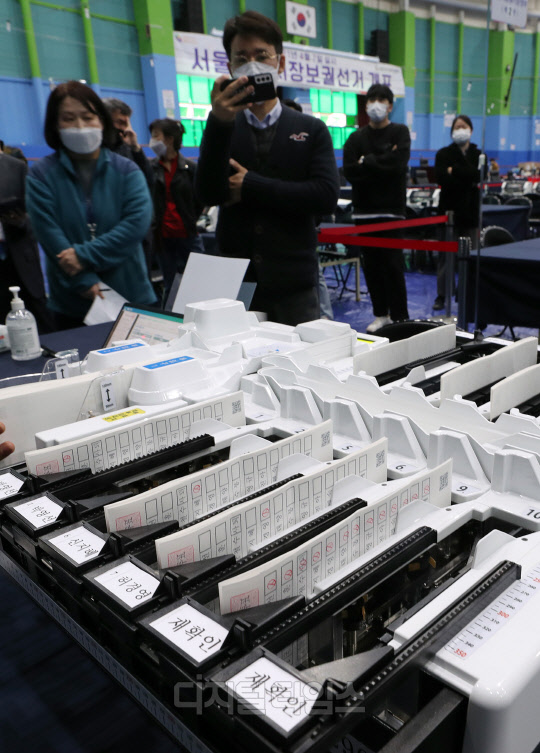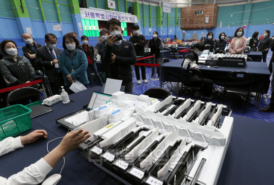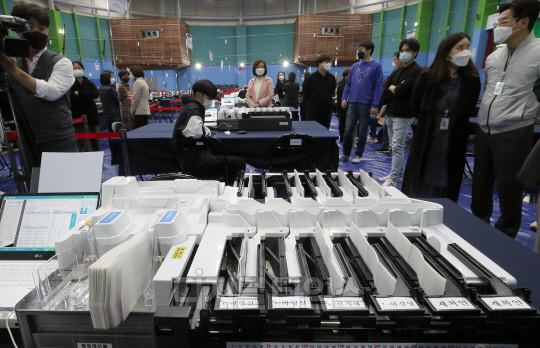 4·7 재보궐 선거를 하루 앞둔 6일 서울 양천구 계남다목적체육관에 마련된 개표소에서 개표사무원들이 투표지분류기 최종 모의 시험을 하고 있다.