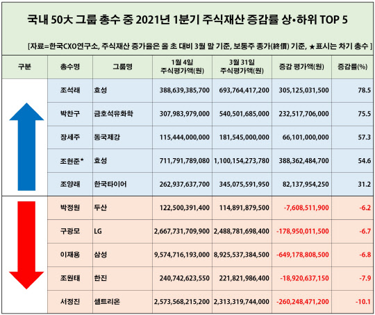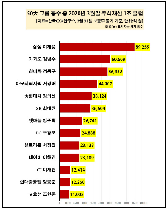 6일 기업분석 전문 한국CXO연구소 분석에 따르면 50대 그룹 총수 중 상장사 주식을 보유한 총수 41명의 주식자산은 올해 초(1월 4일) 75조8183억원에서 3월 말 79조1344억원으로 3조3161억원 늘었다.