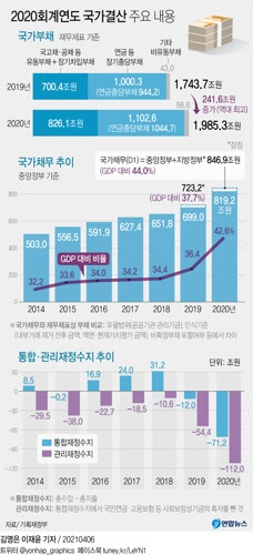 통합재정수지에서 국민연금 등 4대 보장성 기금 수입 등을 제외해 정부의 실제 재정 상황을 보여주는 관리재정수지 적자는 무려 112조원으로 이 역시 사상 최고치를 기록했다. 작년 국가채무는 846조9000억원, 국가채무비율은 44.0%를 기록했다. 채무비율은 전년 33.7%에서 무려 6.3%포인트나 증가하면서 역시 사상 최고치를 찍었다.