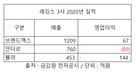 안다르는 오히려 업계 3위인 뮬라웨어의 추격을 걱정해야 할 처지다. 뮬라웨어를 판매하는 뮬라는 지난해 매출 453억원을 기록, 전년 대비 50% 넘는 성장세를 기록했다. 다만 뮬라 역시 지난해 코로나19에 따른 마케팅비 증가로 144억원 적자전환했다. 2019년 23억원이던 광고선전비가 지난해 195억원으로 크게 증가한 것이 주 요인으로 꼽힌다. 반면 안다르는 광고선전비를 2019년 297억원에서 지난해 154억원으로 줄였다.