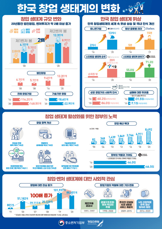 중기부의 창업지원 예산도 1998년 82억원에서 2016년 3766억원, 2020년 8492억원으로 큰 폭으로 늘었다. 최근 4년 간은 4726억원이 증가해 지난 20년 간 증가분의 약 60%가 이 기간에 증가했다. 양적 성장 못지 않게 질적으로 창업 생태계가 성숙돼 가고 있다. 기업가치 10억 달러 이상 비상장기업을 뜻하는 유니콘 기업은 2016년 2개사에서 2020년 13개사로, 6배 이상 많아졌다.