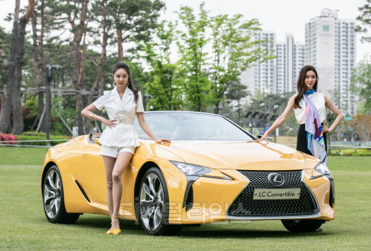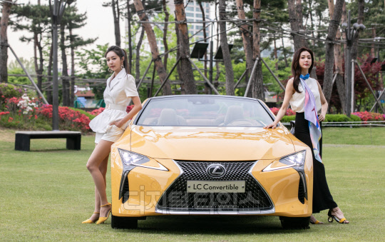 렉서스 코리아 모델들이 29일 서울 송파구 롯데월드몰 커넥트투 야외 전시장에서 플래그십 쿠페 'LC 500 컨버터블' 차량과 함께 포즈를 취하고 있다. LC 500 컨버터블은 렉서스 코리아 20주년을 맞아 국내 처음 출시되는 스페셜 에디션이며, 역동적이고 스포티한 외관과 우아하고 날카로운 주행 성능 등 렉서스가 추구하는 운전의 즐거움과 스타일을 구현한 모델이다.